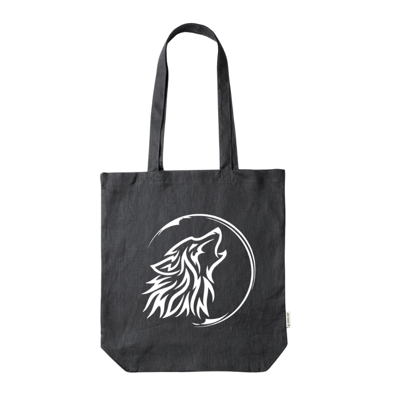 Handlenett i 100 % resirkulert bomull (140 gsm) med forsterkede bærehanker. Melert gråfarget og trykket med stor Ulvehode logo.